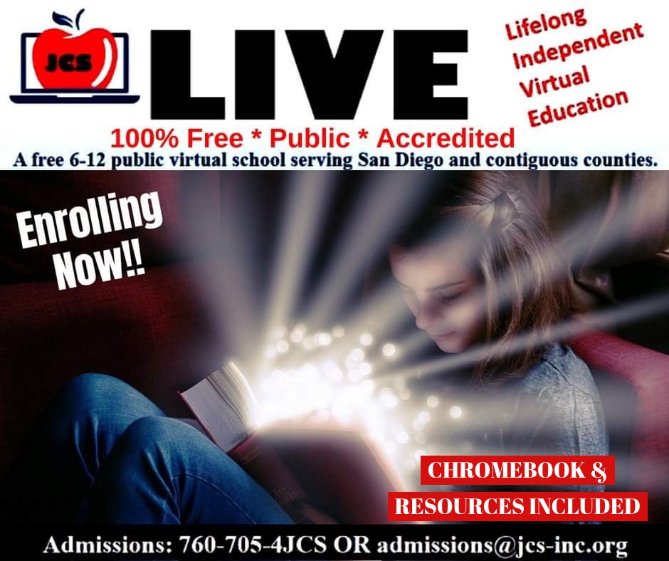 Enrolling Now for Spring Semester. FREE, PUBLIC, VIRTUAL, EDUCATION. Grades 6-12. Call 760-705-4JCS or visit https://julian.jcs-inc.org/