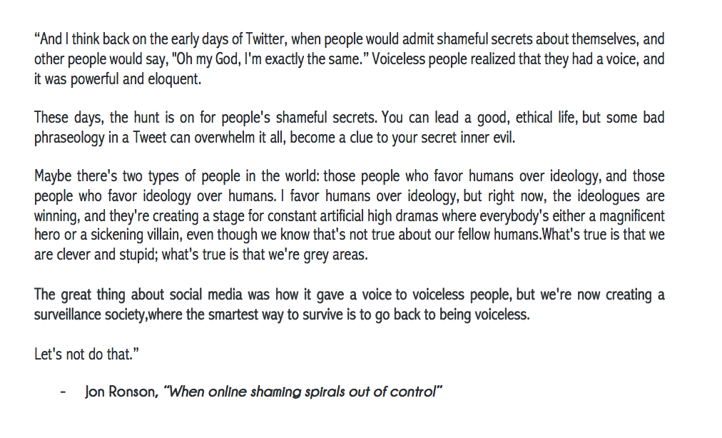 @jonronson's#TEDTalk on#OnlineShaming "a stage for constant artificial high dramas" https://itun.es/us/2wZLj.c?i=349529739 …pic.twitter.com/76uerWTFhS