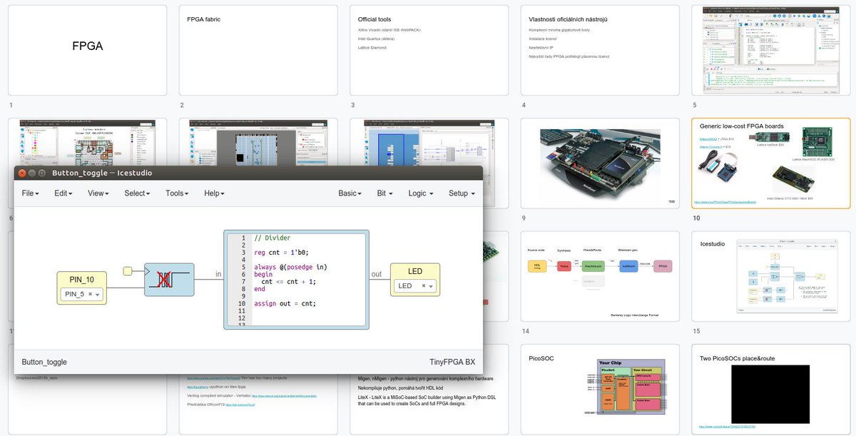 - working on my presentation for this weekend @OpenAlt in#Brno. I'll present#FPGA with#FOSS tools and hardware. Big thanks to@oe1cxw#fpgawars@TinyFPGA@risc_v#OpenAlt#RISCV and many others. https://openalt.cz/2019/program_detail.php#event_18 …pic.twitter.com/GKjdK4dMEC