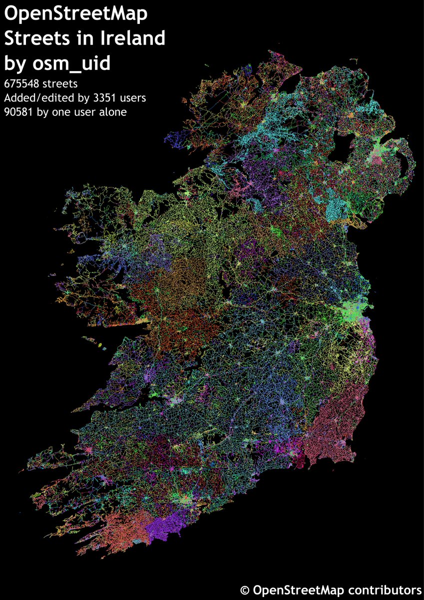 #OpenStreetMap streets in Ireland based on OSM user. 90k by one user alone. pic.twitter.com/204IokuANE