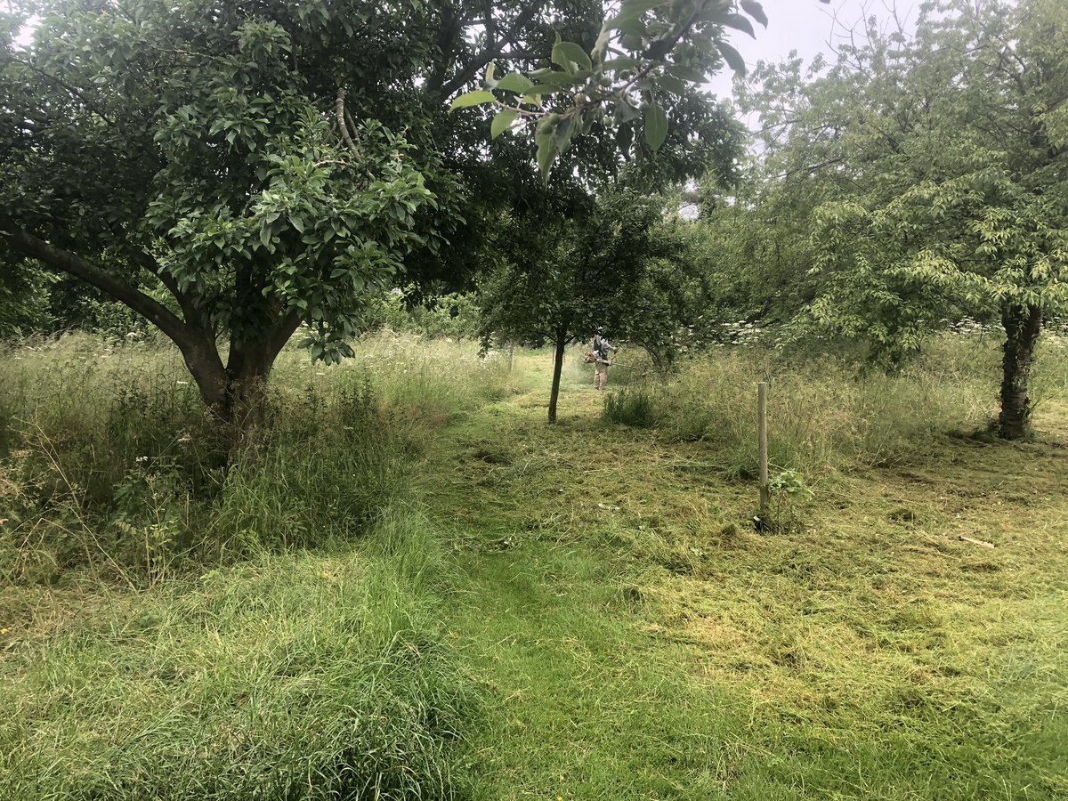 #orchard this morning, last year in the heat wave we made hay for the#goats, this year it’s so sodden and lush we are giving it all to the#chickens pic.twitter.com/np7yWQjiLf