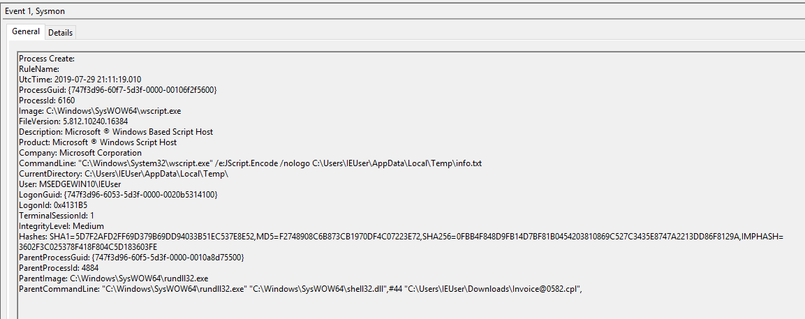 Ostap is delivered also as a Control Panel module https://app.any.run/tasks/8d3f0dfd-e40f-43d3-abe6-3e78de36f34f/ … the wscript.exe remain running for further payloads deploymt, with sysmon one can try event 1 (ProcCreate) not followed by 5 (ProcTerminate) within say 1min for wscript|cscript|mshta|wmic etc.