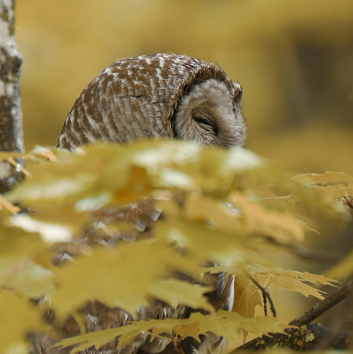 We only see an owl during the day very rarely . This is a photo from a while ago, one of only a few I have that are not infrared night ones.