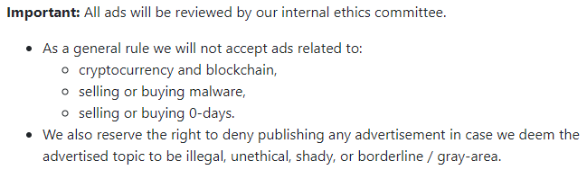 I've updated Paged Out!'s ads page with a note on not accepting any ads related to: - cryptocurrency and blockchain, - selling or buying malware, - selling or buying 0-days. We might update the list in the future in case any more classes of banned ads become apparent.