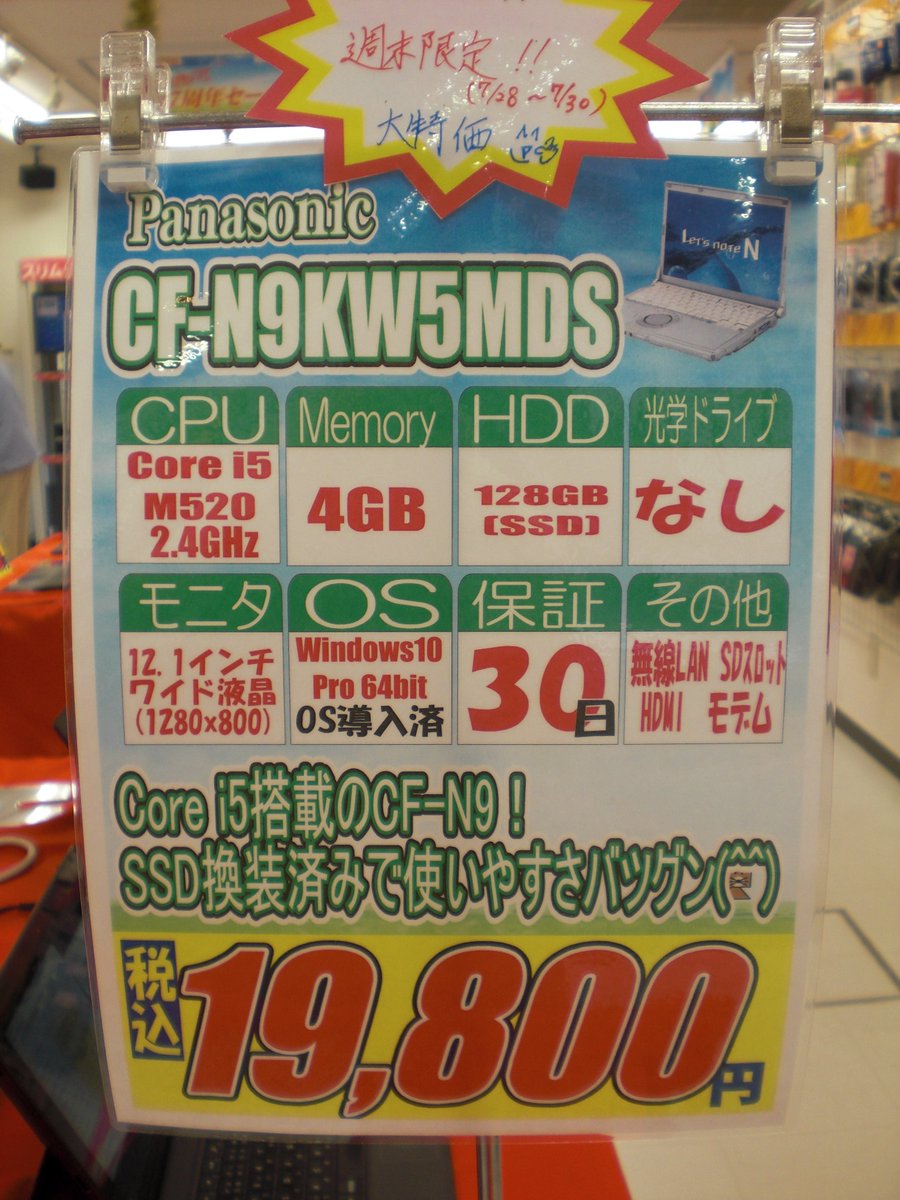 週末特価情報!Panasonic Let's note CF-N9をカスタマイズ!128GBのSSD搭載で¥19,800(税込)。安くても頑丈でサクサク動くマシンをお探しの方にぜひオススメ(^^)
