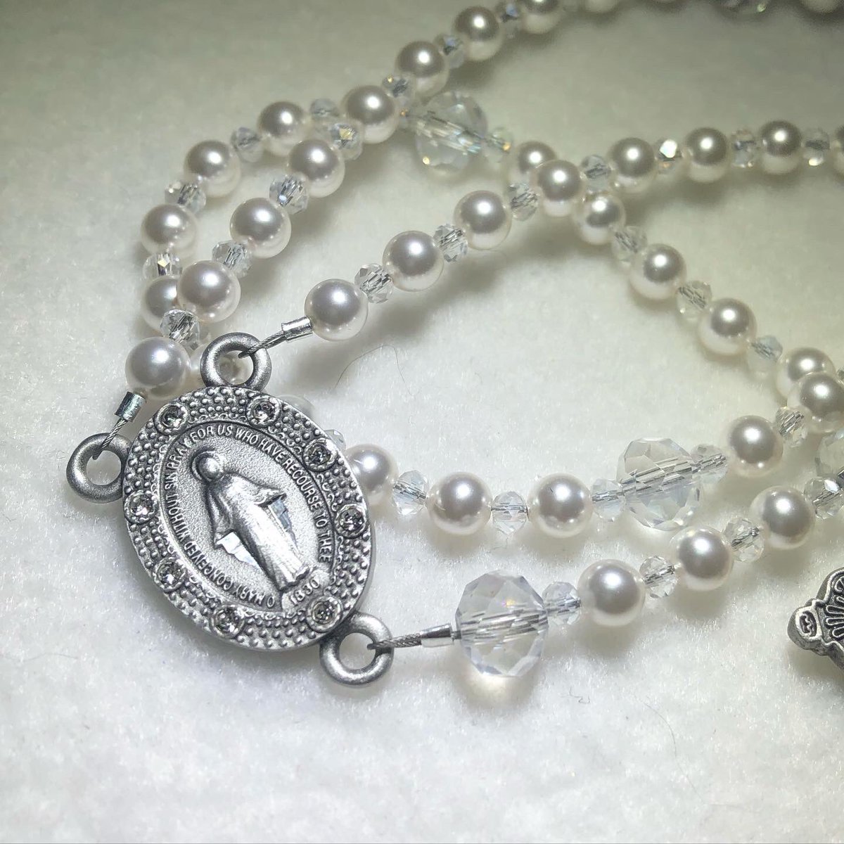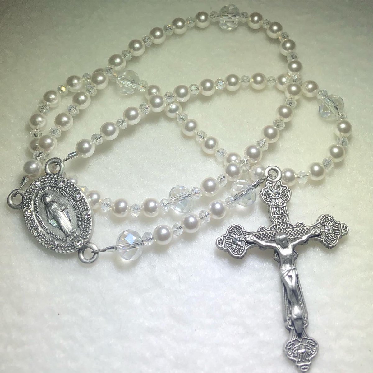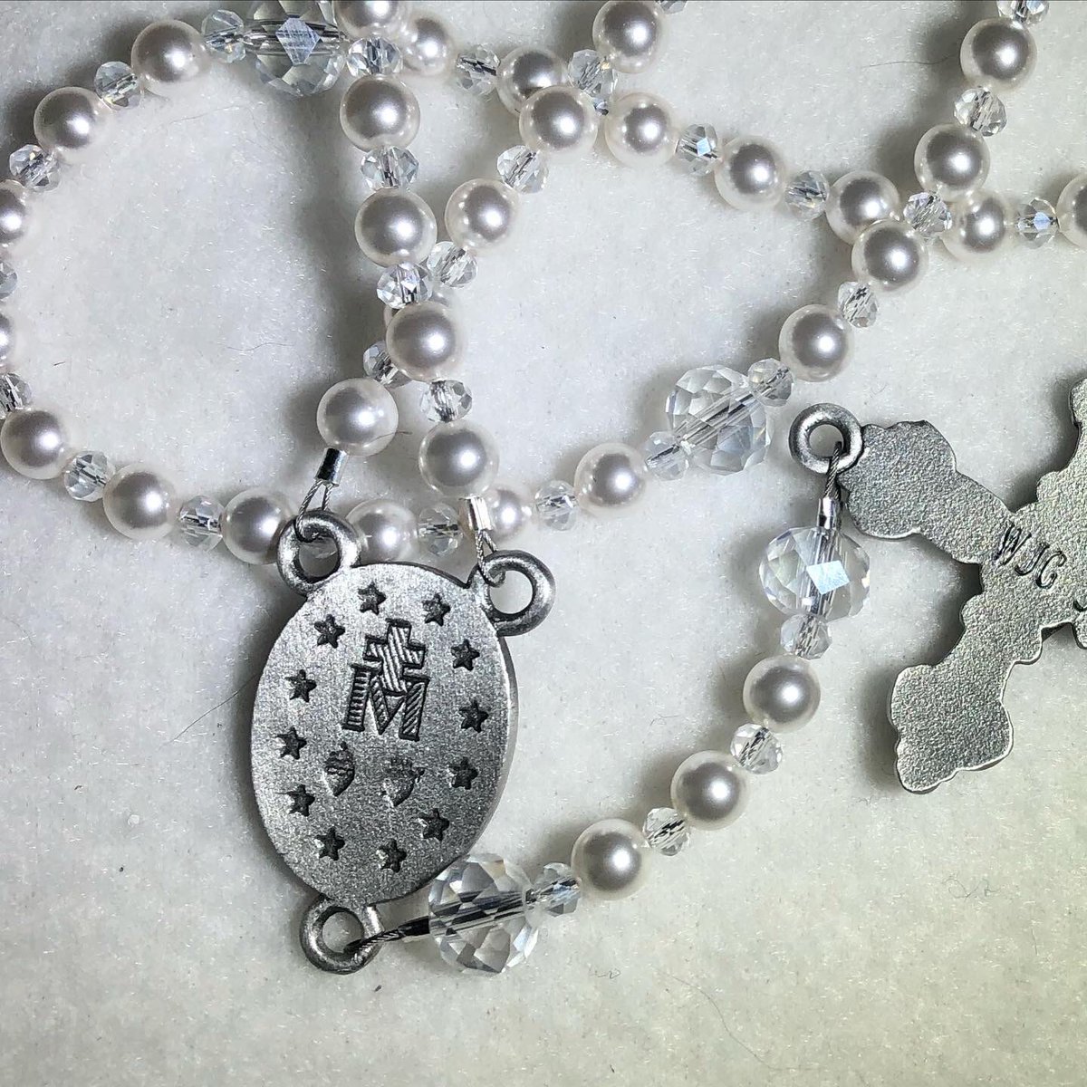 Here comes the bride, carrying her wedding rosary. Engraved crucifix with initials and date, Swarovski Pearl Hail Mary and glass Our Father.