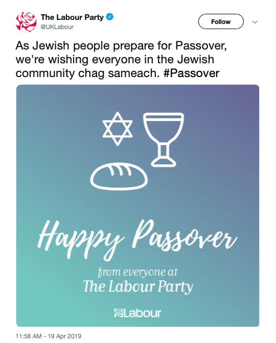 #Pesach, only to discover all of the controversy over this greeting to British Jews from@UKLabour. We’re not sure what all of the fuss is about. Surely the message is simply that@JeremyCorbyn’s Labour Party absolutely loaves Jews?pic.twitter.com/oUJGNXpI23