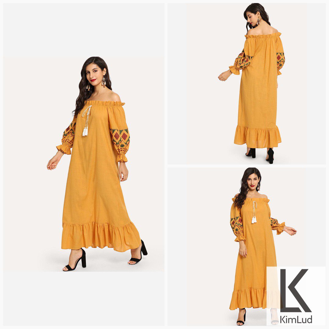 Tassel Tie Detail Frill Trim Off Shoulder Hijab Dress