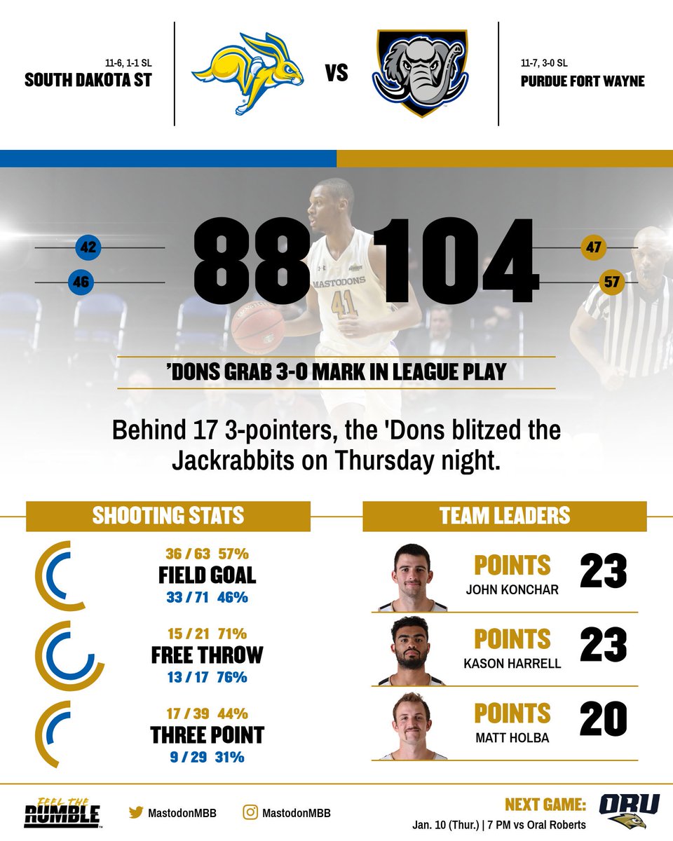 The Mastadons have become the story of the Summit League early in the conference season. Great team effort this evening in the big win over South Dakota State to get to 3-0.