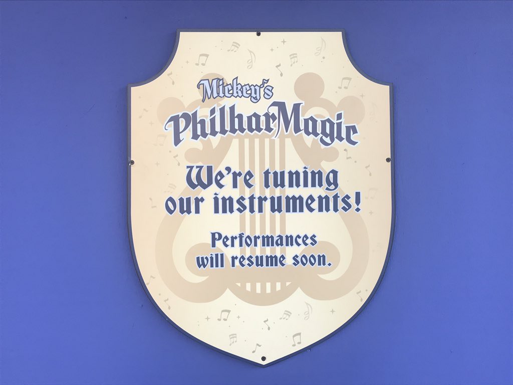 Mickey’s PhilharMagic - Under refurbishment as it welcomes new scene inspired by Coco. Lettering on sign taken down, most likely for repainting.