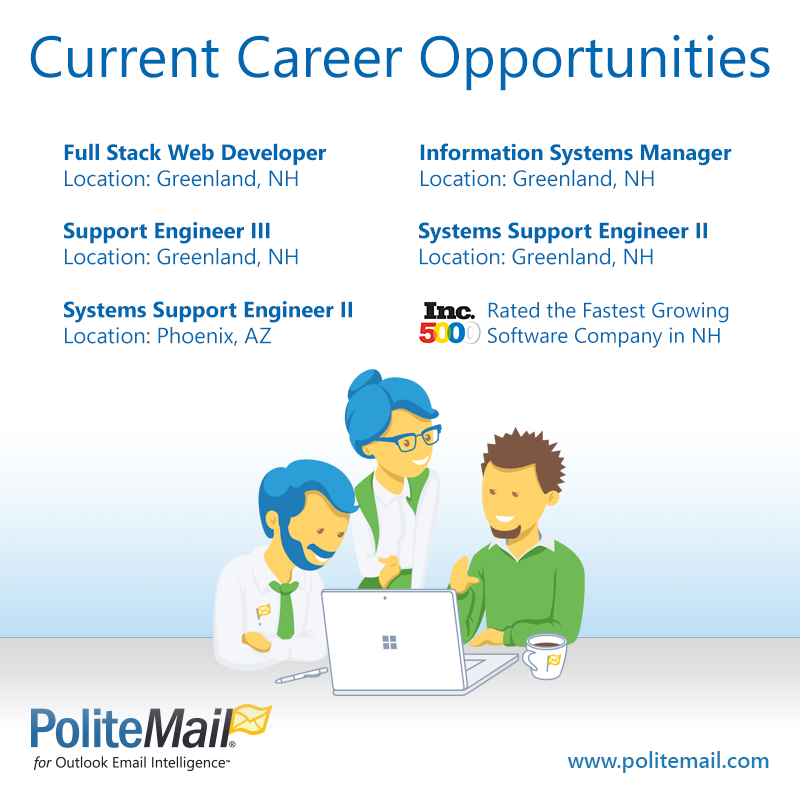 Come work with the fastest growing software company in New Hampshire as ranked by the Inc. 5000. https://politemailsoftware.applytojob.com/apply