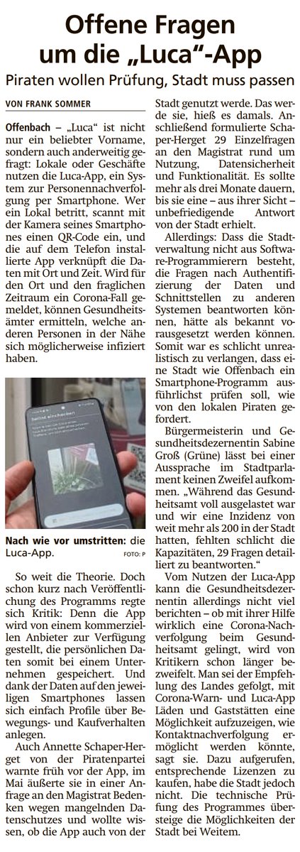 #PIRATEN in der#Stadtverordnetenversammlung#Offenbach fragen nach. Über ein Vierteljahr hat die Stadt gebraucht, um Fragen zur#lucaapp nicht zu beantworten. Man hat die App halt vom Land übernommen. Hätten sie auch gleich sagen können. Offenbach-Post:pic.twitter.com/dHktVj7Sfo