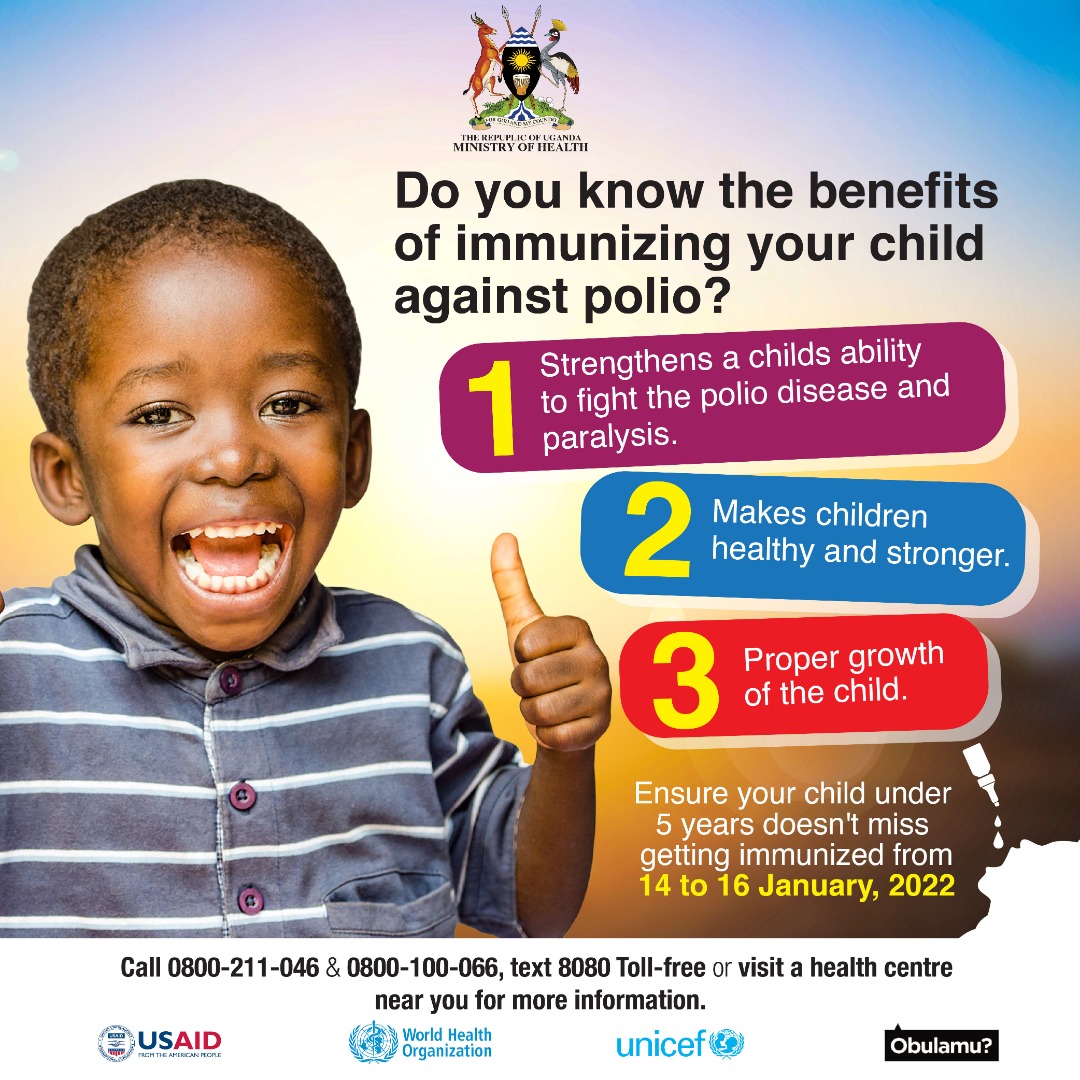 #Polio vaccination campaign will take place from tomorrow Friday 14 January 2022 to Sunday 16 January 2022 across the country.@MinofHealthUG#actualtruthUG#KeepUgandaPolioFreepic.twitter.com/bDQ7L7L0s2