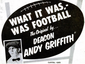 “What It Was, Was Football” is a 1953 monologue by Andy Griffith. It's a description of a college football game, as seen by a naive country preacher who attends the game by accident and is entirely puzzled by it.