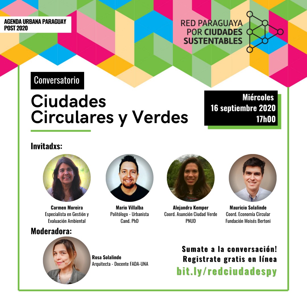 𝐂𝐈𝐔𝐃𝐀𝐃𝐄𝐒 CIRCULARES Y VERDES | 16/𝟬9 - 𝟭𝟳𝗵 ¿Qué necesitan nuestras ciudades para aprovechar mejor sus recursos (naturales/materiales/humanos) y transformarse en ciudades circulares y verdes? Registro: http://bit.ly/redciudadespy