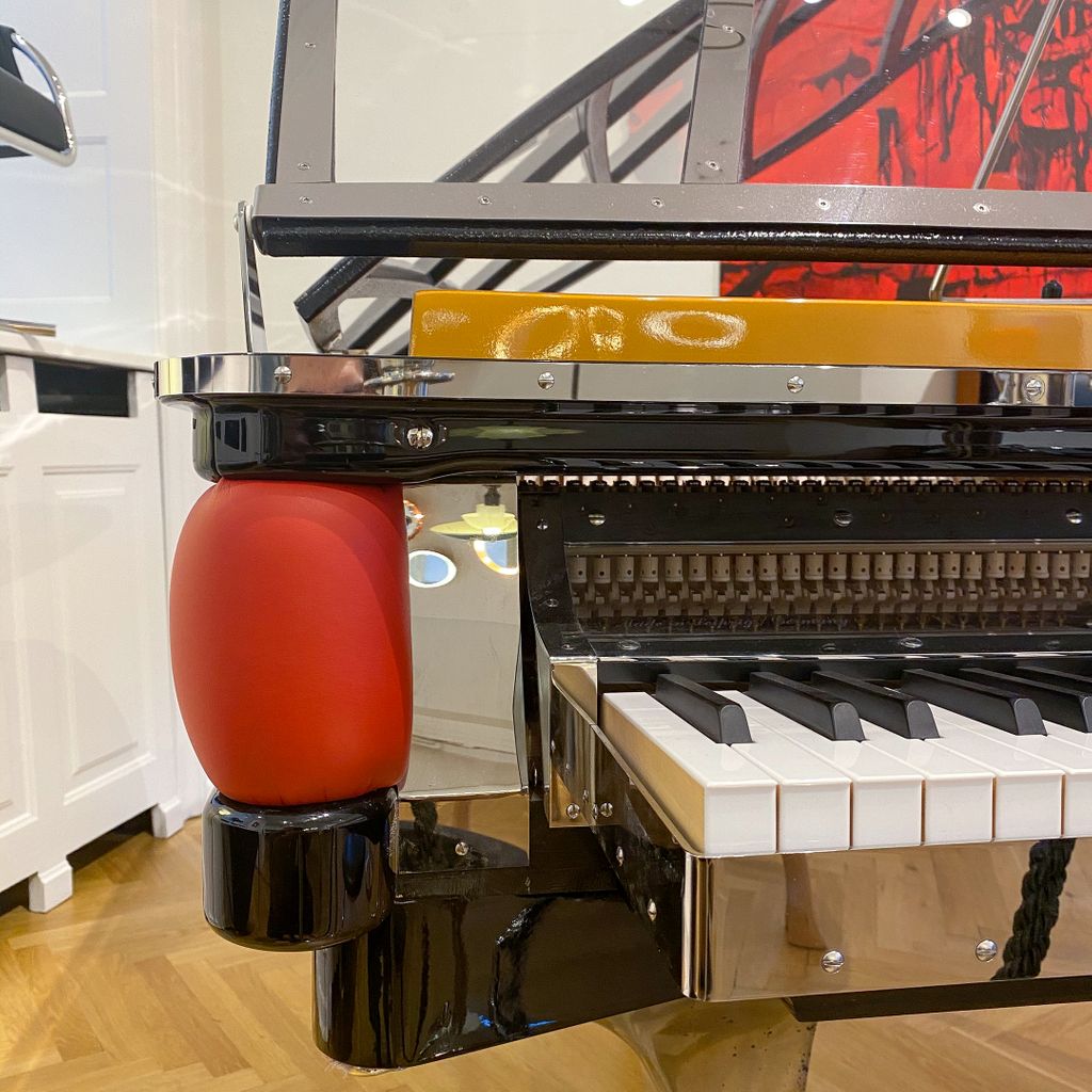The red leather on the PH Grand Piano adds a great contrast to the black and white.
