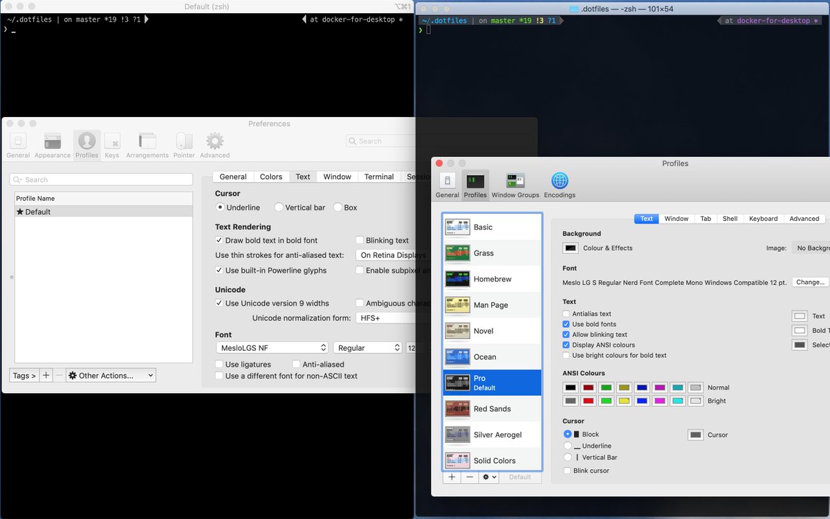 #powerlevel10k (https://github.com/romkatv/powerlevel10k …) on my macOS laptop. It visibly works in Terminal (on the right) but not in iTerm2 (on the left, some colors are missing even if I have installed the required fonts, "MesloLGS NF")...