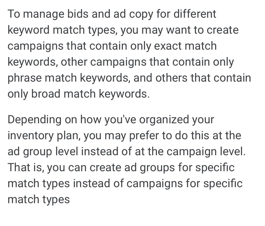 #ppcchat. For the@GoogleAds users breaking out match types into separate ad groups or campaigns, Google seems to agree those are both viable options. https://twitter.com/BrettBodofsky/status/1418257155006808074 …pic.twitter.com/RXtLKR1DVE