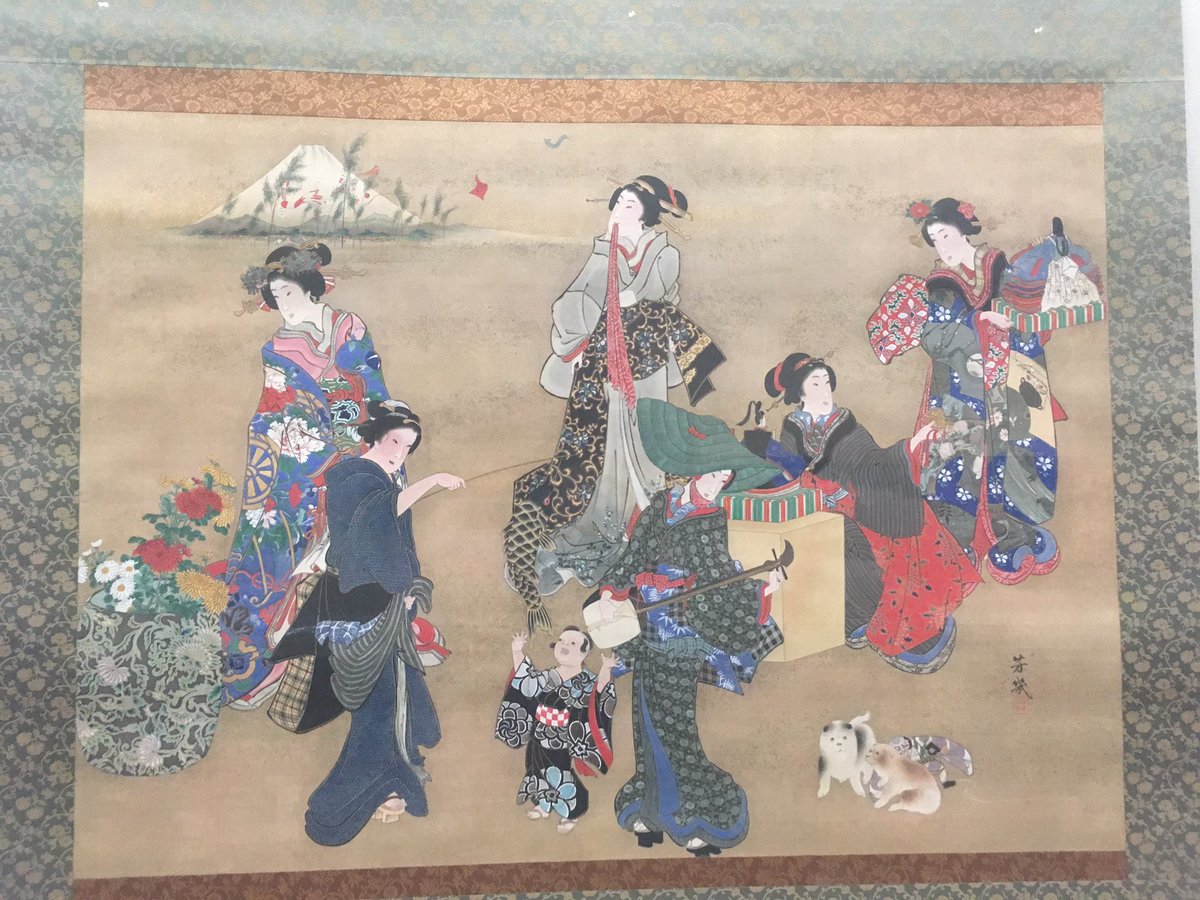 Scroll painting depicting festivities by Ochiai Yoshiiki: new year, doll festival, chrysanthemum, children’s day