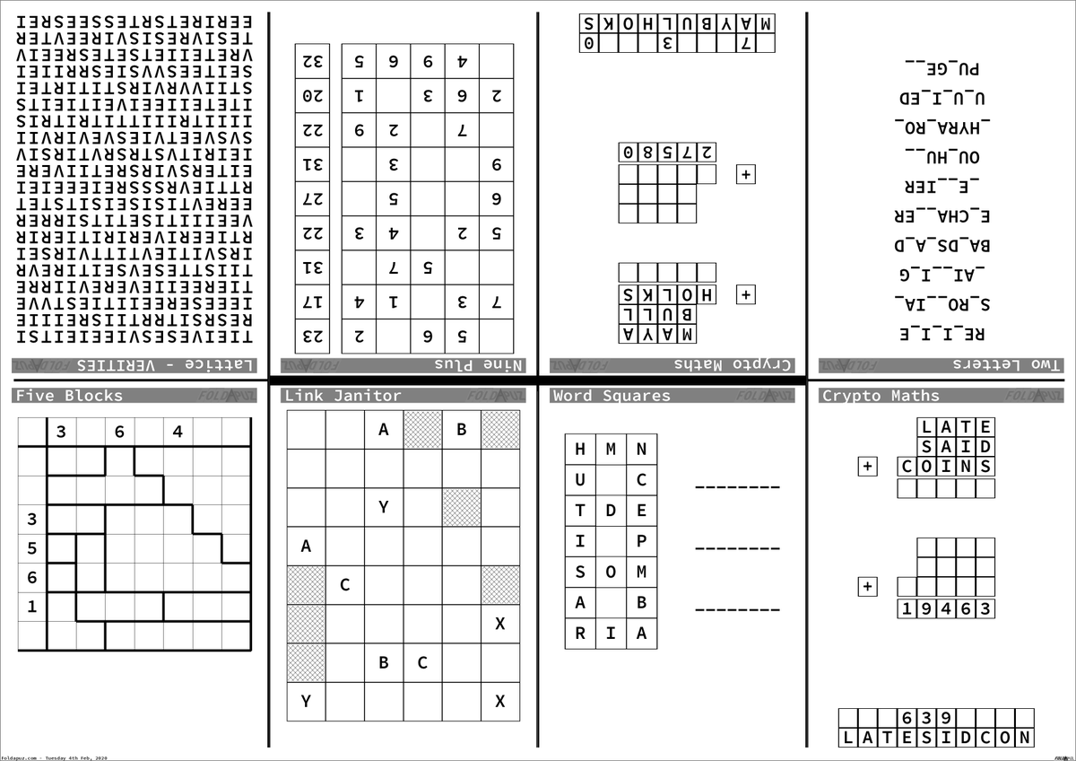 A new game joins the Fold. In Crypto Maths, each letter represents a different number, 0 to 9. Try to figure out what values they all have, solve the maths, and work out the missing word. Spoiler : This one's quite hard! Print - Fold - Play :