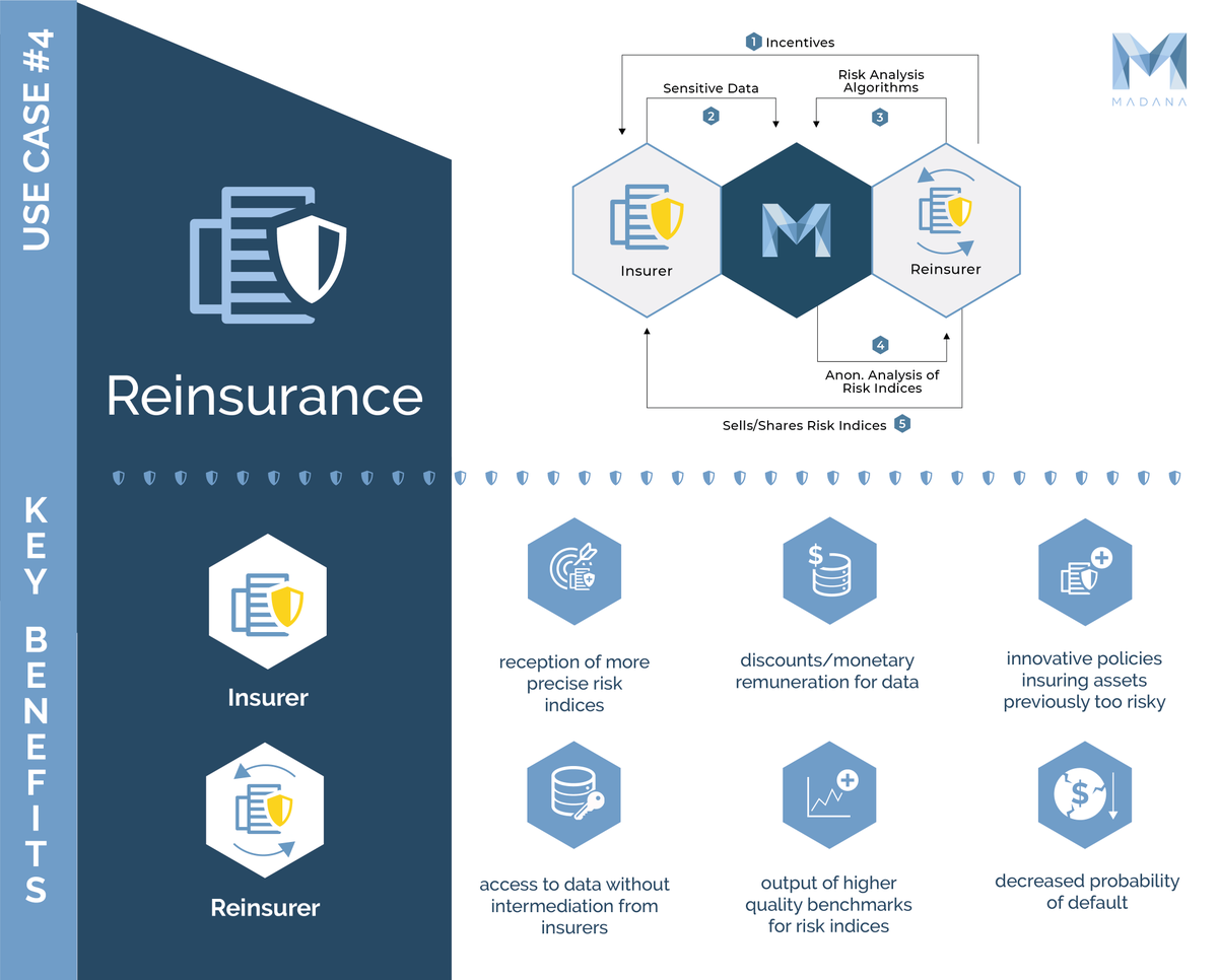 #UseCaseSeries - Reinsurance With MADANA,#reinsurance providers can develop more precise risk assessments, adding value to both their business and#insurance providers, allowing the latter to offer more and better services.#MDN#PrivTech#DataPrivacy#privacy#Insurtechpic.twitter.com/wJNDjatpC1