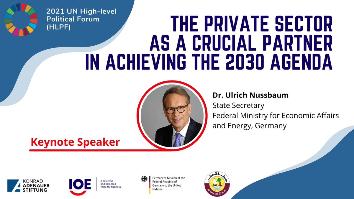 & partners @ioevoice,@KASonline &@QatarAtUN are hosting an#HLPF Side Event on how the#PrivateSector can play its role in achieving the#2030Agenda with keynote speech by Dr. Ulrich Nussbaum of@BMWi_Bund.