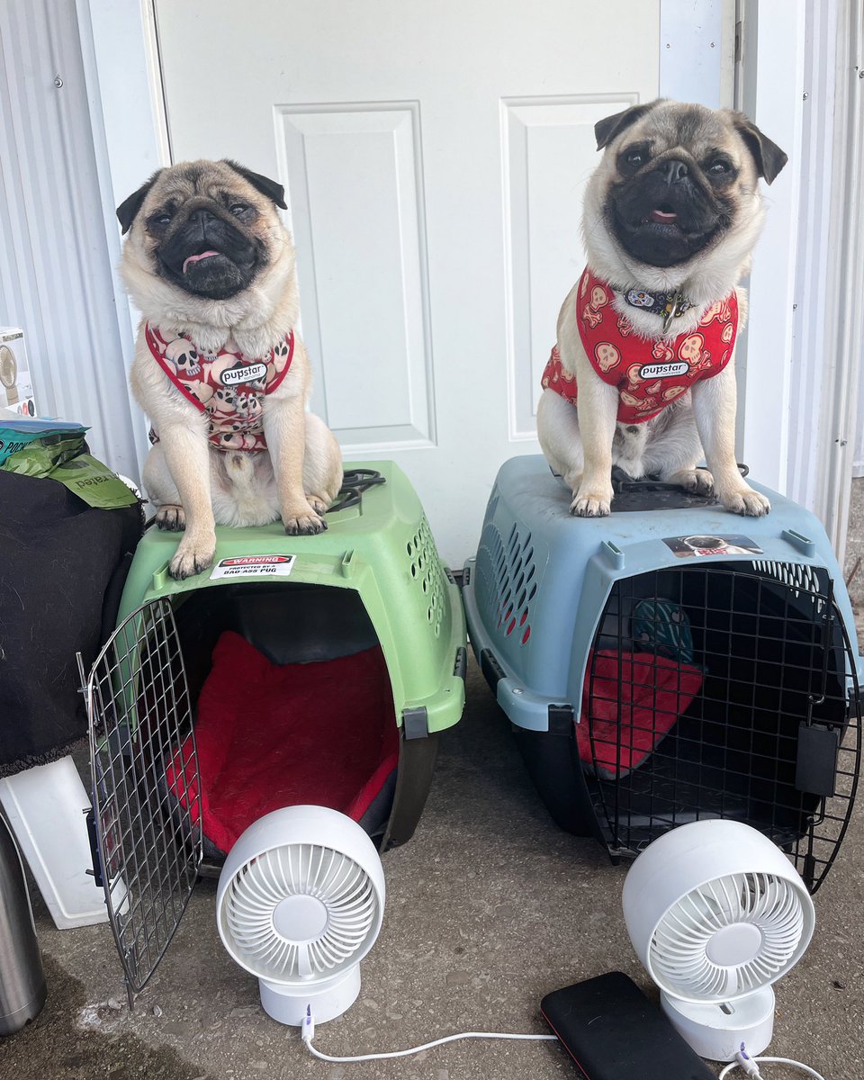 We smushy faced pugs run agility & sometimes it’s HOT! Mom keeps us safe & cool with our personal fans and our