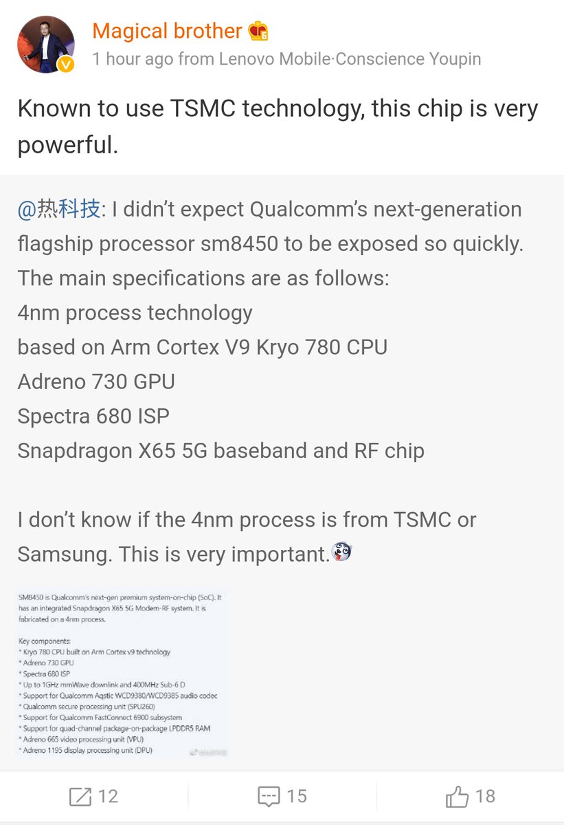 A Lenovo General manager confirmed that Qualcomm SM8450 (Snapdragon 895) will use TSMC’s 4nm process.