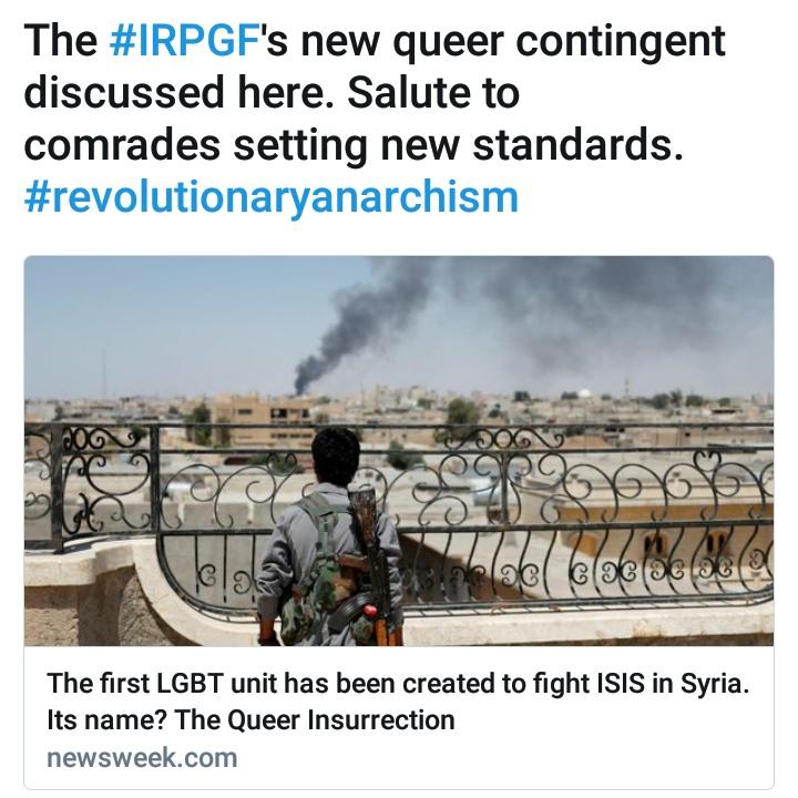 #Queer Insurrection & Liberation Army fighting homophobic ISIS in Syria http://ow.ly/Ymp430dUGvY#LGBTpic.twitter.com/wjUOlv2oxU