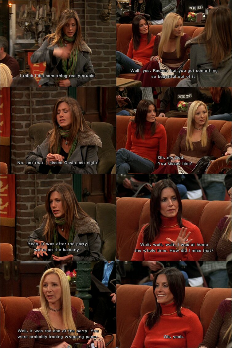#Monica: You kissed him?#Rachel: Yeah. It was after the party, we were on the balcony &... M: Wait wait wait. I was at home the whole time. How did I miss that?#Phoebe: It was the end of the party, you were probably ironing wrapping paper. M: Oh yeah...pic.twitter.com/QA7h7CqQyJ