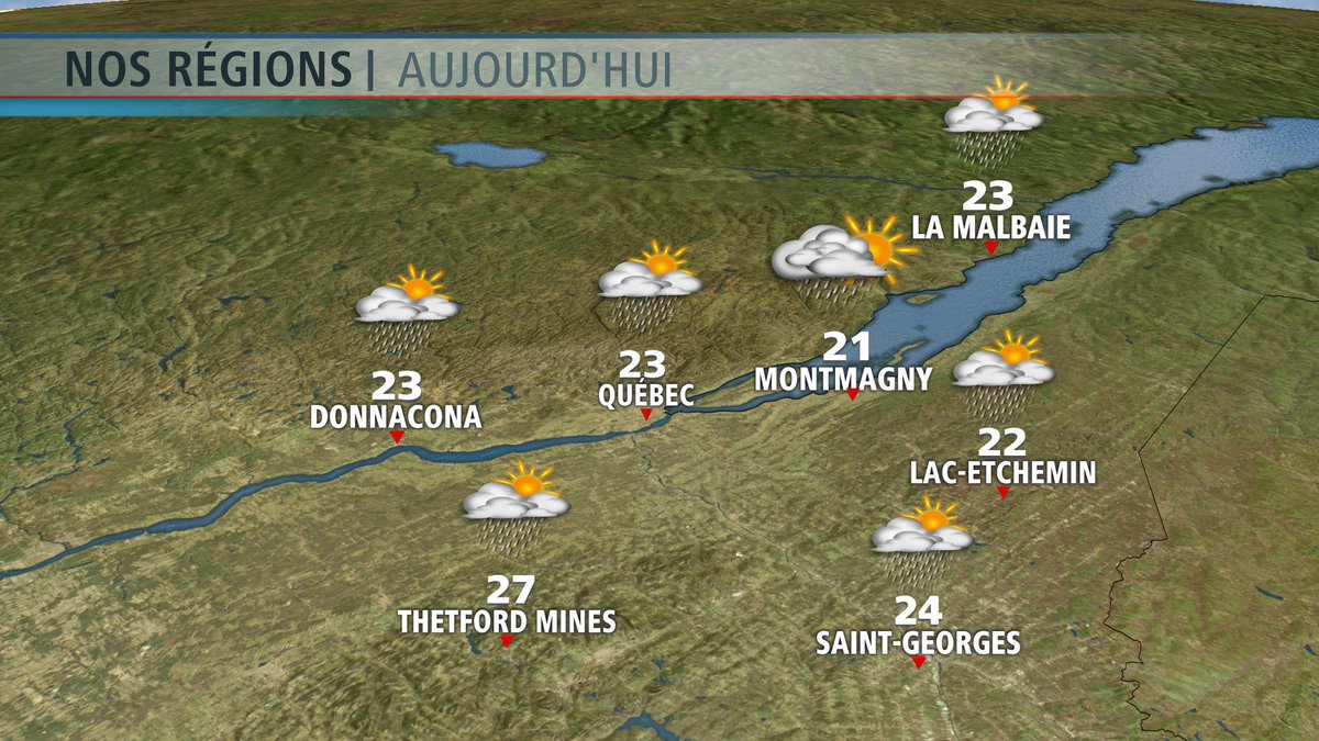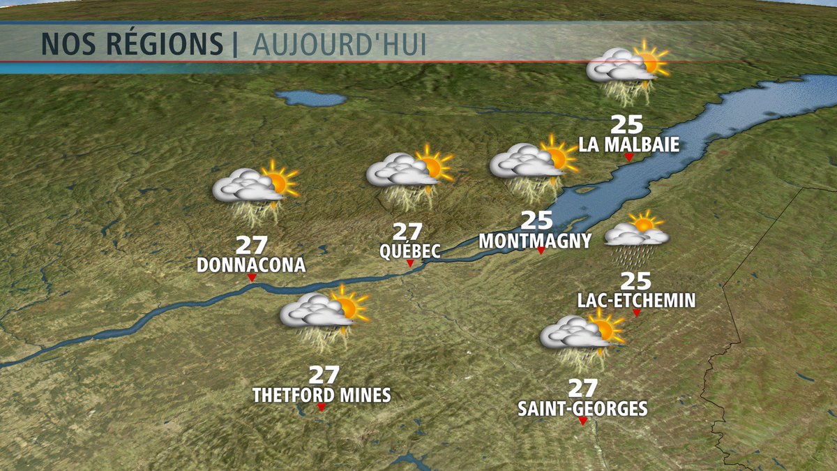 Avez-vous entendu les orages la nuit dernière? Ils ont laissé une dizaine de mm d'eau à Québec. Aujourd'hui, on aura une alternance soleil/nuages avec 60% de risque d'averses et d'orages. Températures chaudes, humidex 32. Venteux S-O 20 km/h, rafales à 40. Bon jeudi!