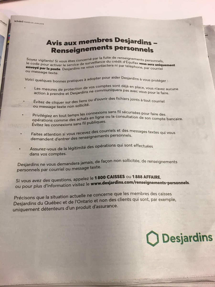 @DesjardinsCoop explique à ses membres que le code de surveillance Equifax sera envoyé uniquement par la poste#rcqc pic.twitter.com/zvzJtL42qJ