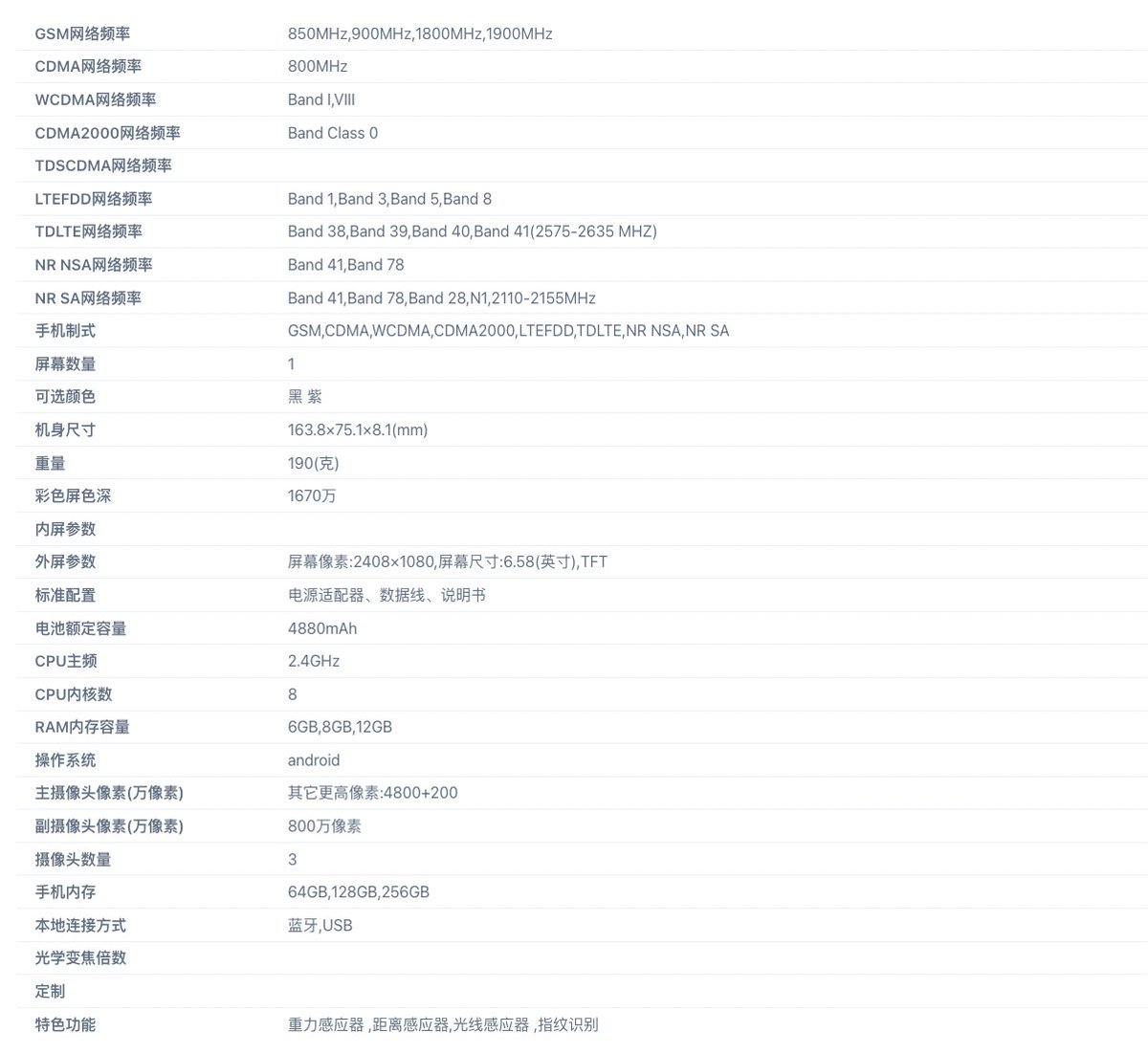 Realme RMX3571 163.8×75.1×8.1(mm) 190g 6.58-inch TFT 2408×1080 display 4,880mAh battery 6GB,8GB,12GB 64GB,128GB,256GB 48MP + 2MP Gravity sensor, distance sensor, light sensor, fingerprint recognition It will launch in India as well.