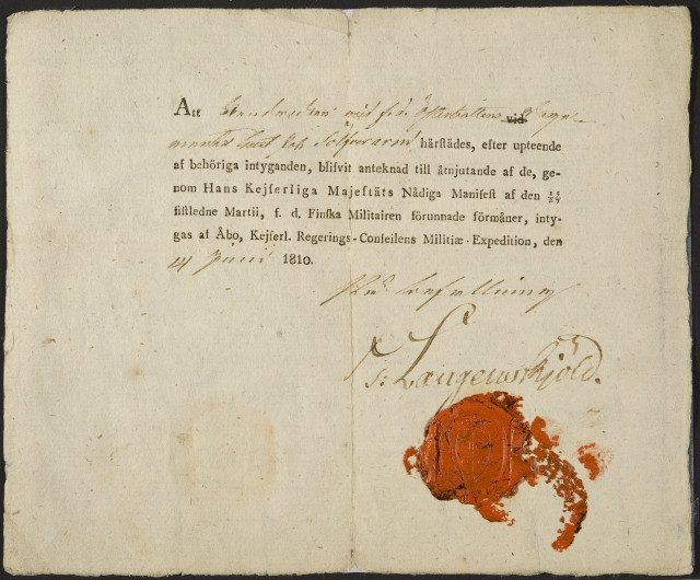 todistus Suomen armeijalle kuuluvien etuisuuksien säilyttäm... 1810. Museovirasto, Historian kuvakokoelma https://www.finna.fi/Record/musketti.M012%3AHK19580412%3A4 …
