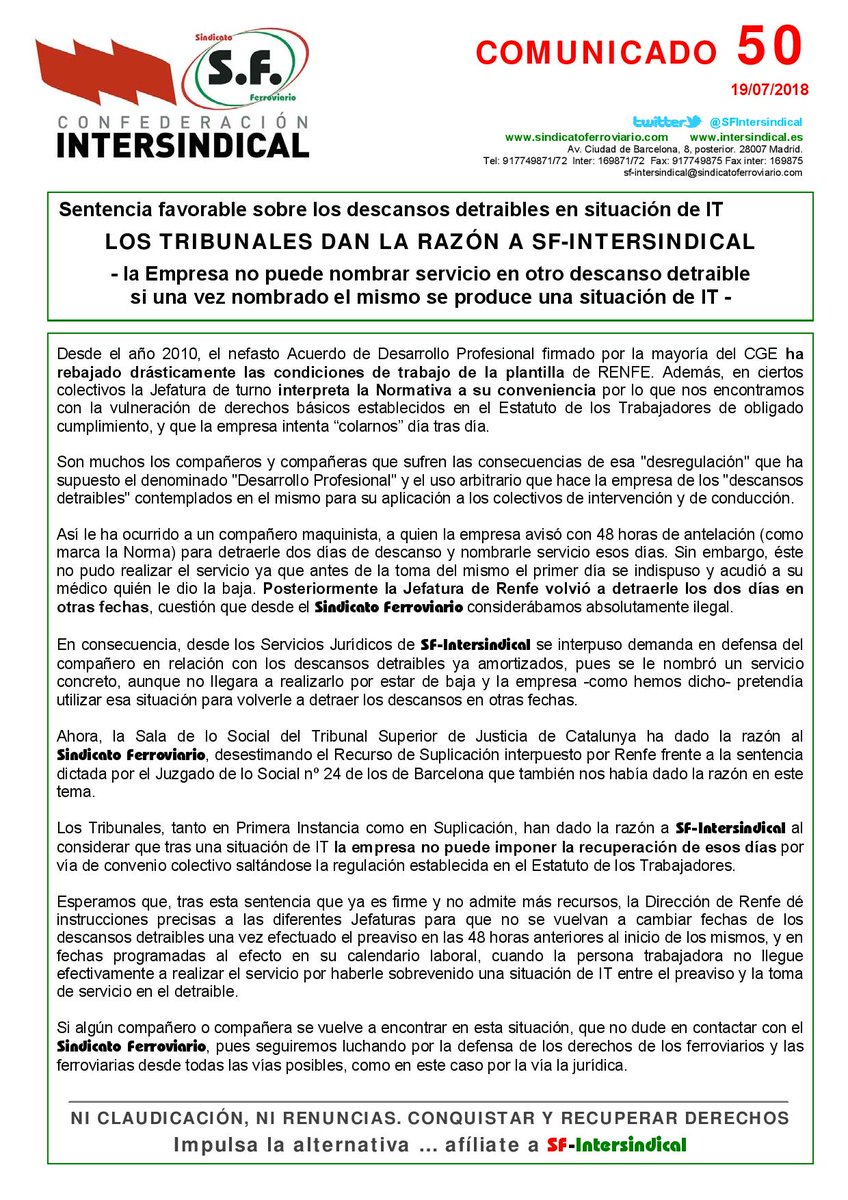 @SFIntersindical: La empresa#Renfe no puede nombrar servicio en otro#descanso "detraible" si una vez nombrado el mismo se produce una situación de#IT. Los días de baja no son recuperables!!pic.twitter.com/A9HuzL4duS