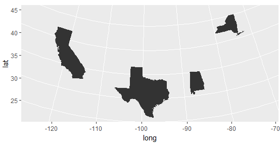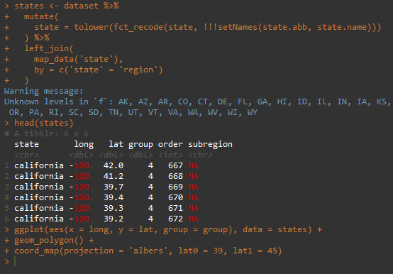 #ggplot2. You'll find state polygons in map_data("state"), but it uses lowercase names, not 2-letter codes. A simple fct_recode before a left_join clears it all up. (Pardon the ugly map; minimal#reprex.) pic.twitter.com/bi5aXaGdE3