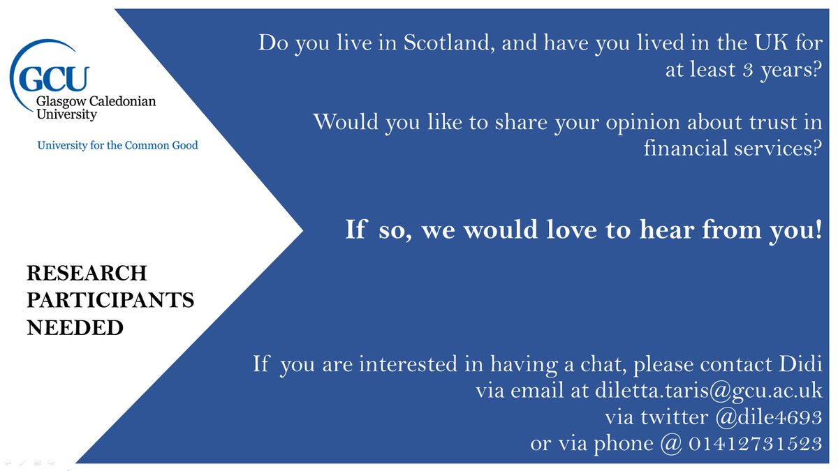 @GCUResearch. Do you fancy sharing your views about Trust&Finance? If so, please contact me and/or share this post so we can discuss further.#trust#finance#research#PhDchat#recruitment#researchparticipants#GCUPhDpic.twitter.com/85Lz6dYKjk