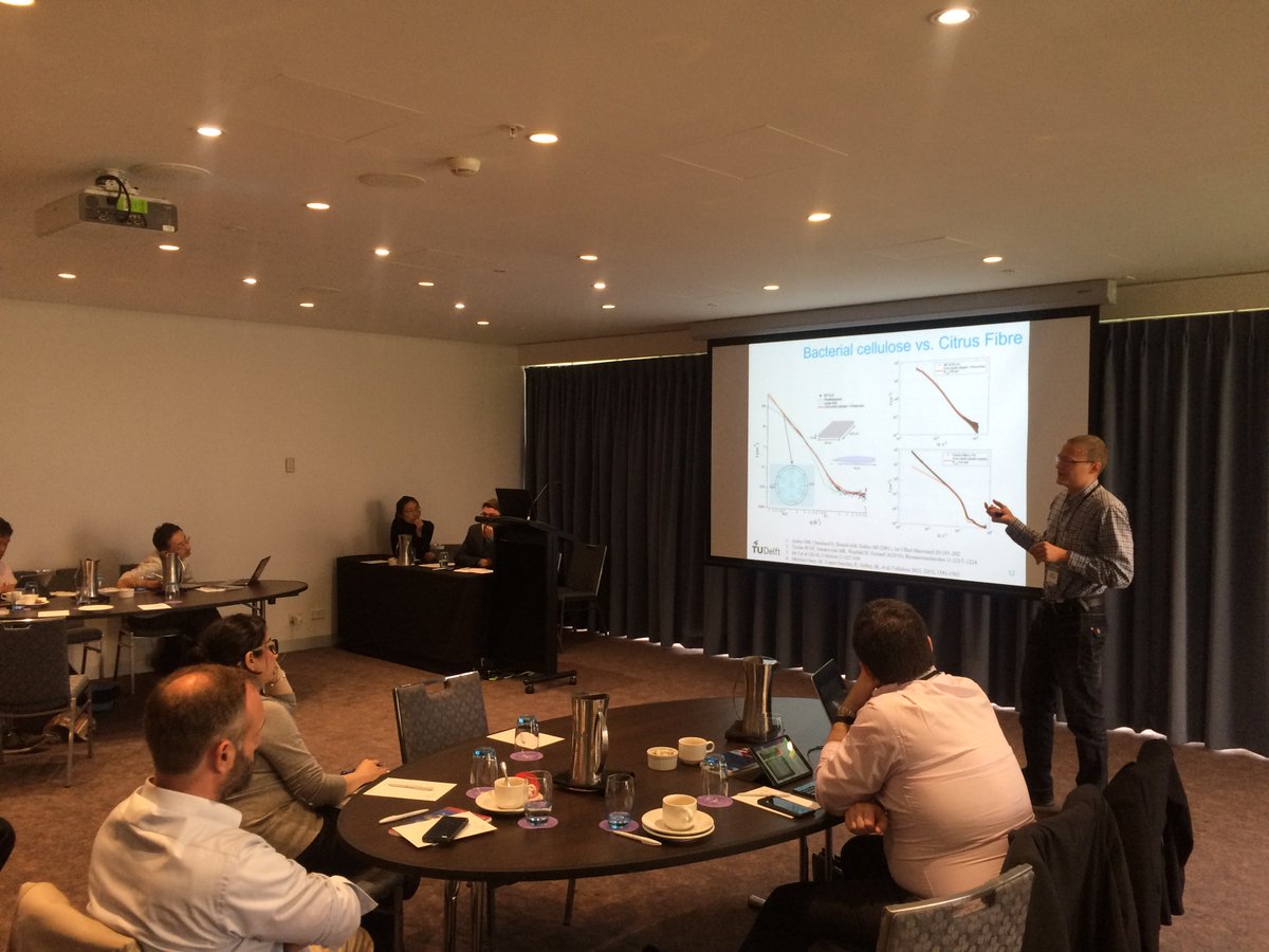 explained how he combined #rheology & small-angle#scattering of#neutrons &#Xrays for assessment of#microfibrillated#cellulose under#shear. Interesting data collected at@ANSTO on#bacterial#cellulose vs#citrus#fiber.#NeutronsandFood5pic.twitter.com/ONLccG53dX