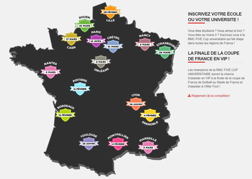 #RMCFIVECUP Universitaire est de retour! Inscrivez-vous dès maintenant à l'une des 16 étapes qualificatives pour la grande finale du 8 mai prochain à Paris! http://rmcsport.bfmtv.com/evenement/rmc-five-cup/ …pic.twitter.com/2LYct0TmzN
