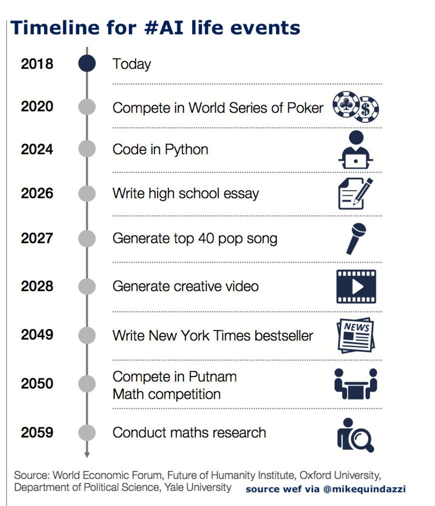 #AI timetable >> aiming to re-defining the#FutureofWork >>@WEF via@MikeQuindazzi >>#ArtificialInteligence#Robotics#IoT#DataScience#BigData#DeepLearning#MachineLearning >> http://bit.ly/2FvXZoY pic.twitter.com/g8Q6lrgFJY