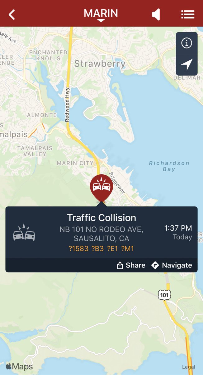 #MarinCounty#Hwy101 Northbound before#Donahue there is a crash in the right lane. Traffic is slow from#Rodeo.#KCBSTraffichttps://twitter.com/SMFDinfo/status/1432081456919048196 …