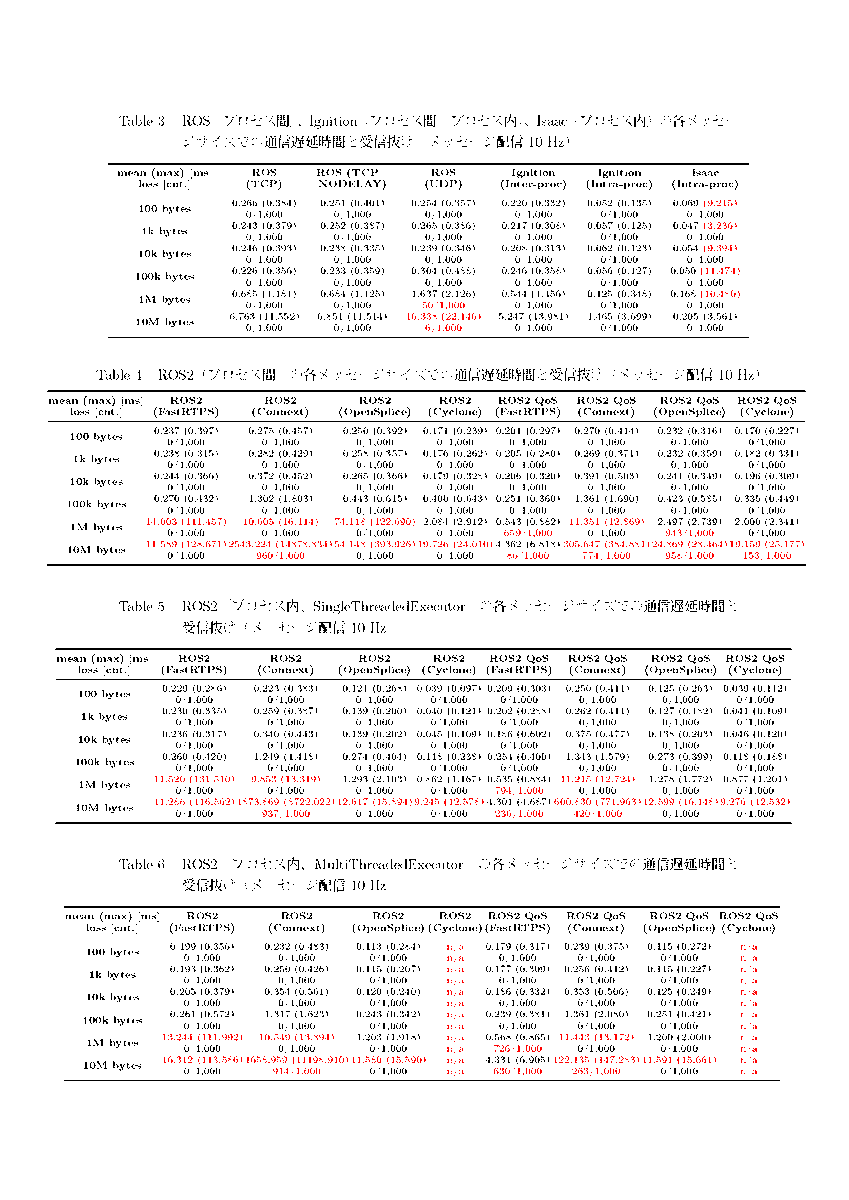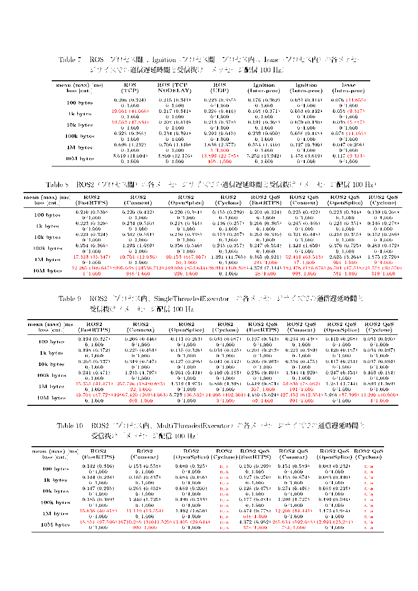 ROS、ROS2、Ignition、Isaac のメッセージ通信の遅延と受信抜けを評価した結果です。赤字は問題箇所。ROS (TCP_NODELAY) と Ignition の性能が良い。 プロットしたグラフなど、詳細は ROBOSYM2020 で発表します。 ROS2 は概念。使用する DDS 実装によって、性能が大きく異なるようです。