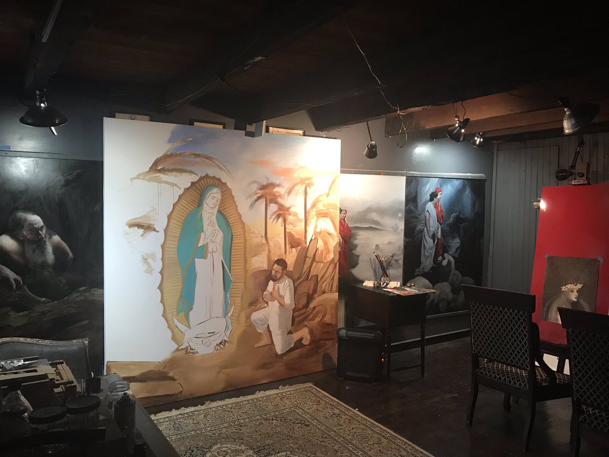 The south wall of my studio as of this morning. Several panels in my Dante’s Inferno series look small next to my commission of Our Lady of Guadalupe for a church in Nova Scotia. Oil on canvas 7ft x 7ft.