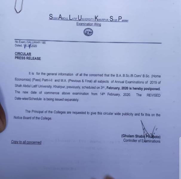 شاھ عبداللطيف يونيورسٽي خيرپور چوٿون چڪر ڪاليج سائيڊ امتحانن جي تاريخ وڌائي ڇڏي، جن شاگردن جي داخلا ورتل هئي ۽ امتحان ڏيڻا هين اهي وڌيڪ پنهنجي پنهنجي ڪاليج سان رابطو لازمي ڪريو