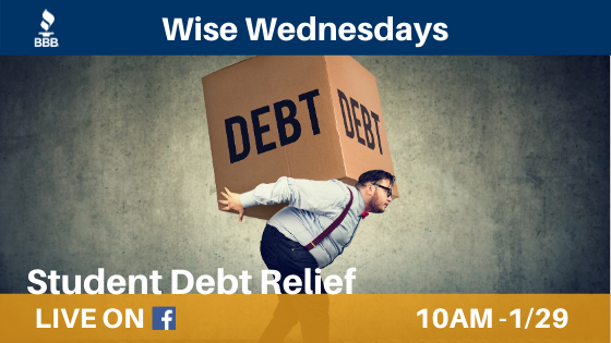 #WiseWednesday live? It's up on YouTube: https://youtu.be/NtYCa7Gt1Ik Student Debt causes fear and anxiety for millions of Americans. Scammers promise to take care of it quickly and easily - for a "nominal" fee. View the full video for#BBBTips to spot and prevent#scams. pic.twitter.com/1lZfyYMmjv