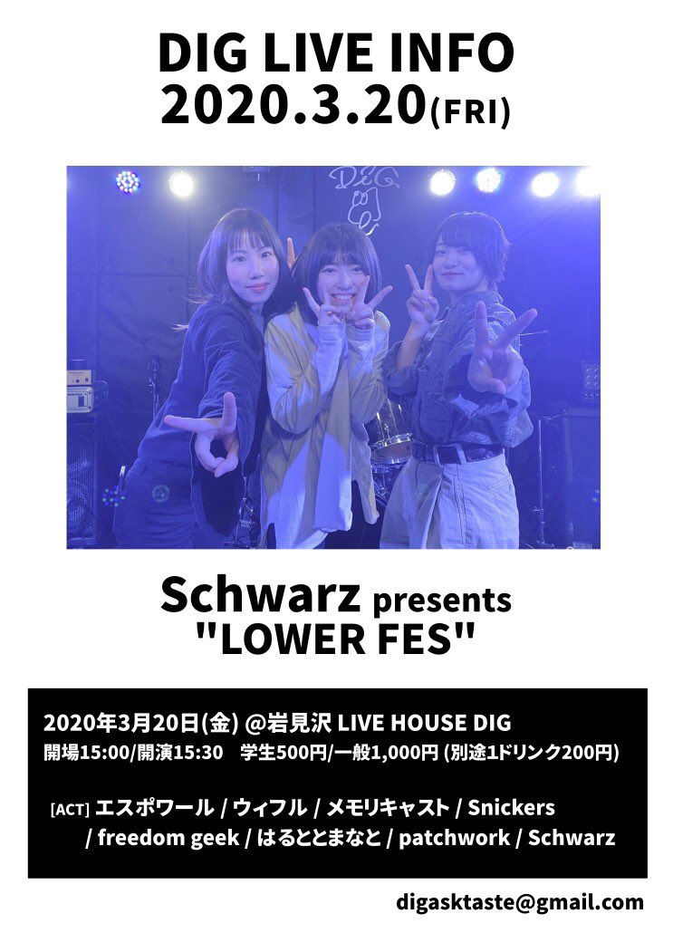 2020年3月20日 Schwarz pre “LOWER FES” @岩見沢DIG チケット一般1000円 1D200円 学生 500円 Open15:00 start15:30