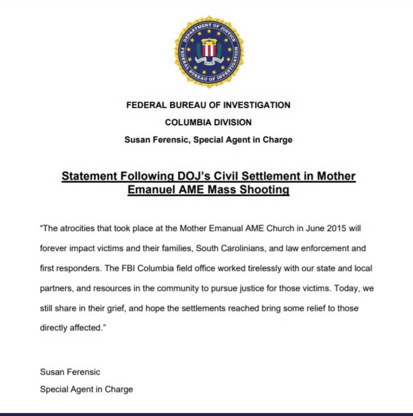 The FBI, the agency responsible for gun background checks, issues statement on settlements in Charleston's Emanuel AME Church mass shooting: "Today, we still share in their grief, and hope the settlements reached bring some relief to those directly affected."