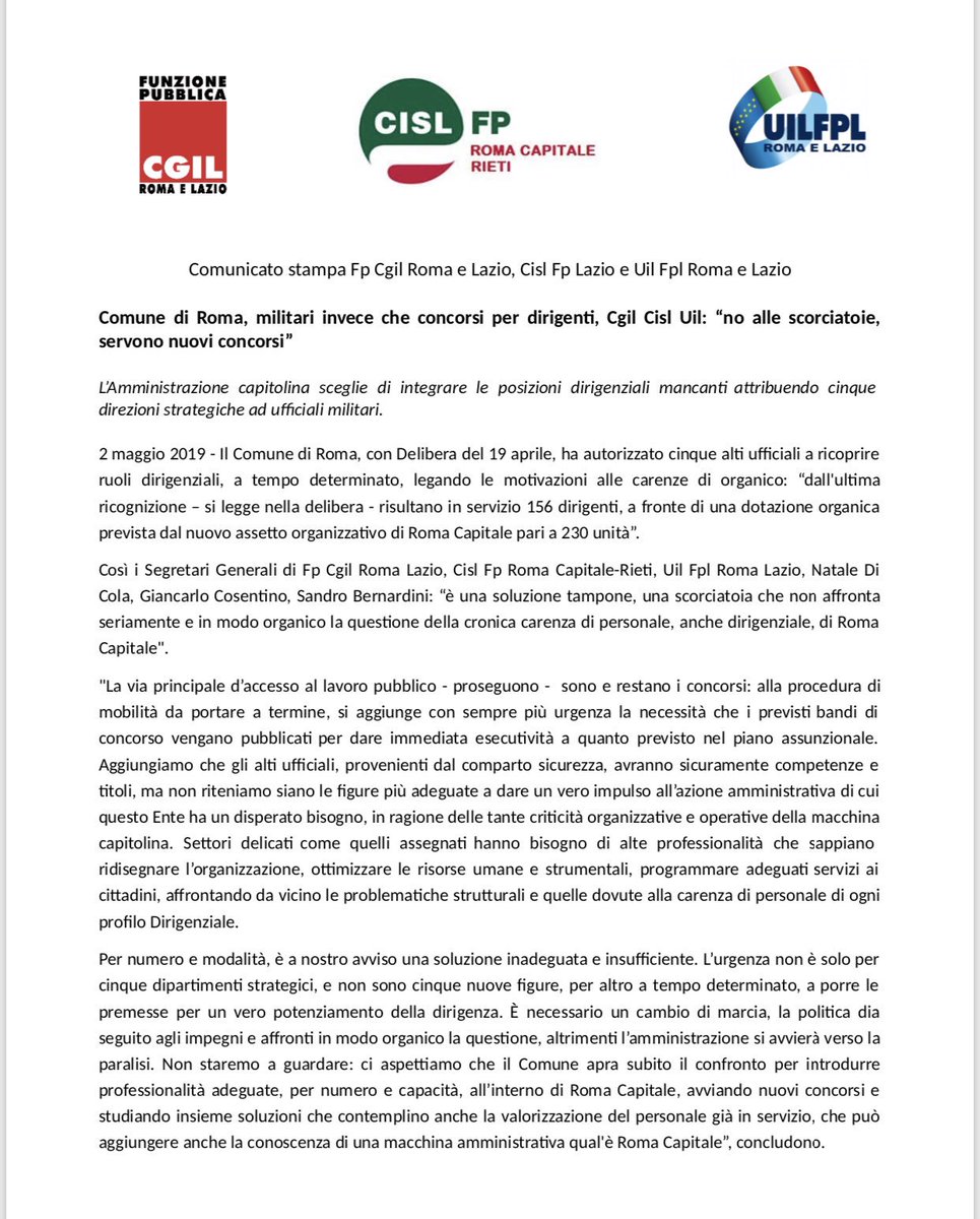 Comune di Roma, militari invece che concorsi per dirigenti, Cgil