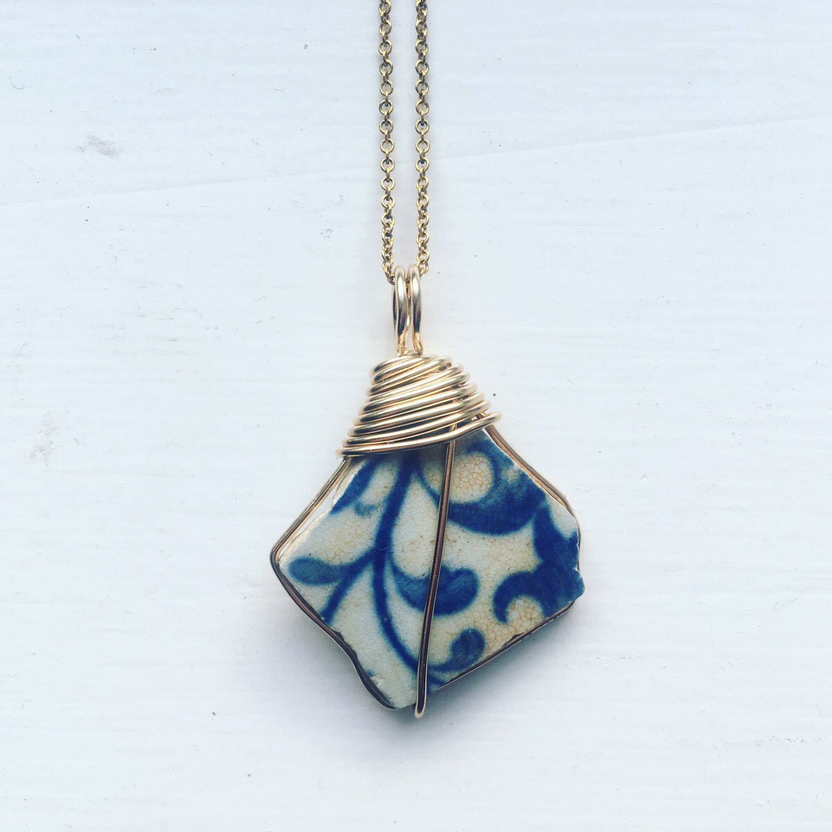 Love this beautiful wire wrapped blue & white sea pottery pendant on a gold filled chain. It would make a perfect gift for yourself or any history lover https://etsy.me/2wun4NX