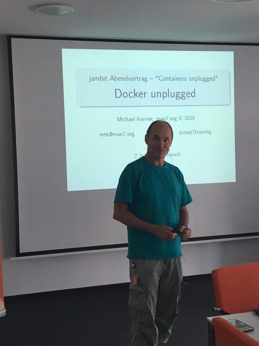 #ContainersUnplugged series,@mkerrisk is looking underneath#Docker today. How does it make use of#namespaces,#capabilities,#cgroups and#seccomp? Interesting talk here at#jambit!pic.twitter.com/5wrgRoMrWh